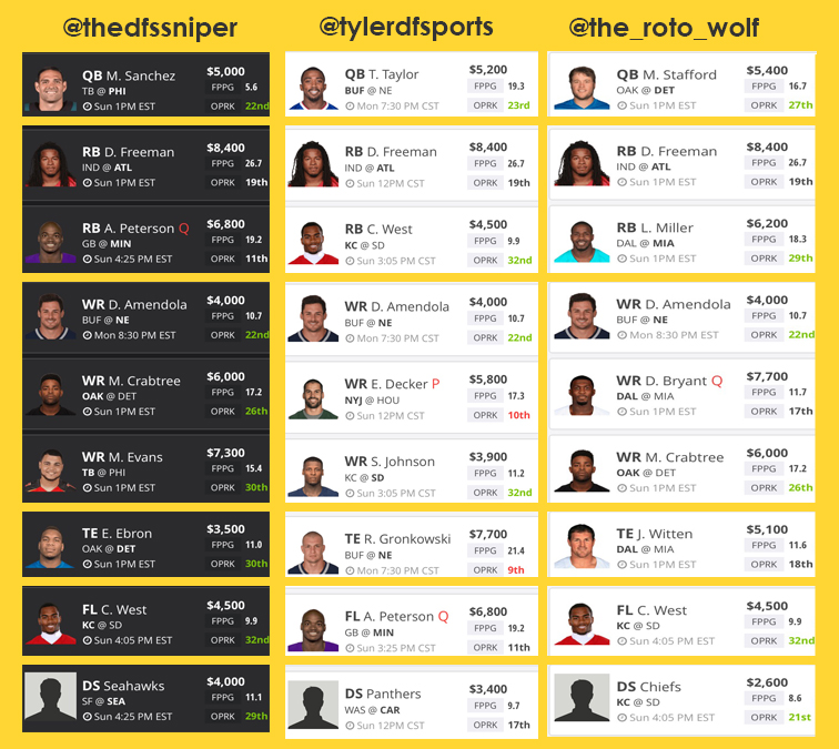 This is our only consensus play of the week. Since the Pats played in the night game after salaries were released, DK was unable to adjust his price for injury, so Chandler is priced below tight ends Vernon Davis, Brent Celek, Jared Cook, and Lance Kendricks. After Gronk went down, Chandler hauled in 5 catches for 58 yards and a score on an impressive 11 targets. If you’re punting at tight end, and not rostering Scott Chandler, you’re doing in wrong.